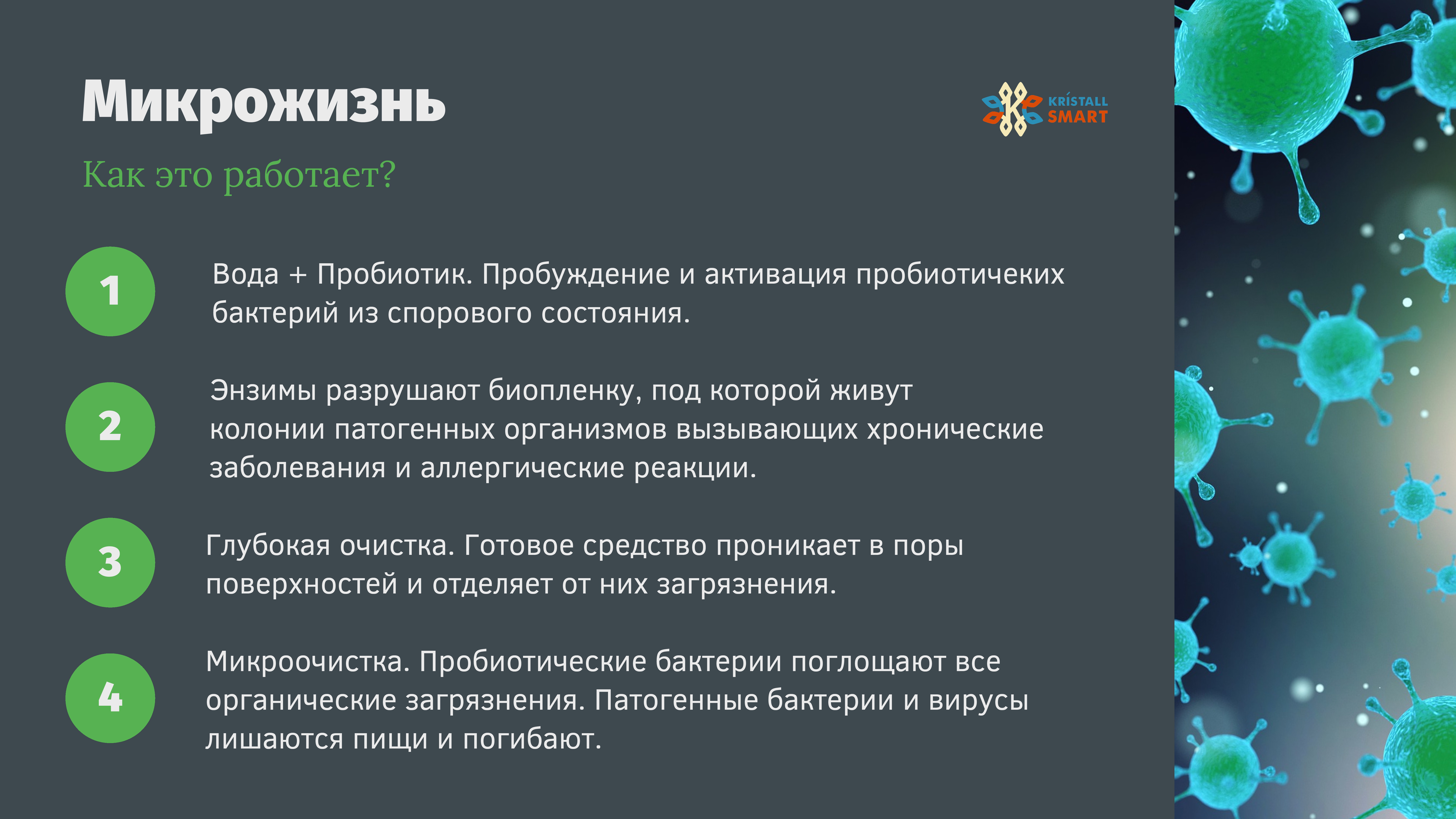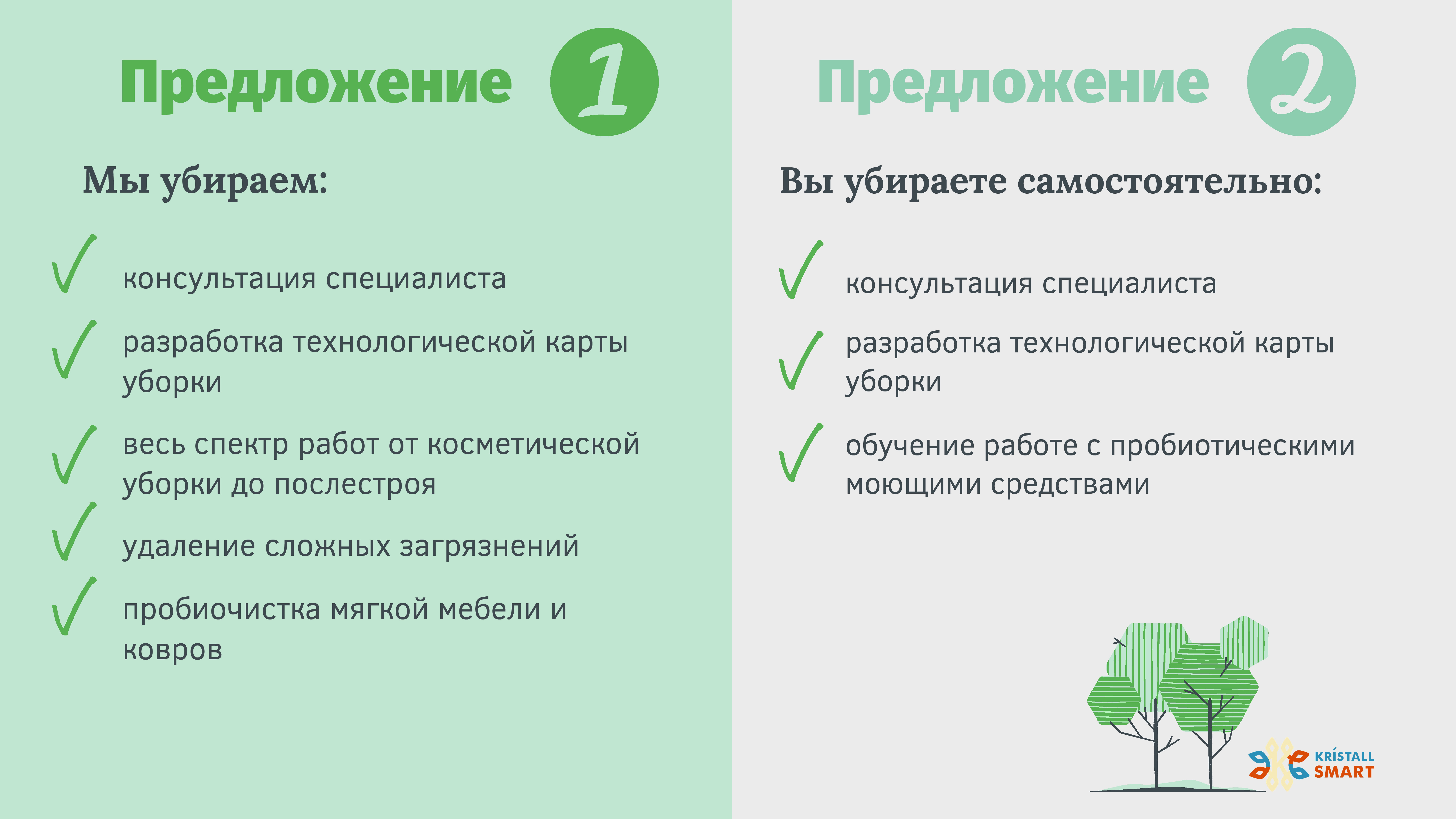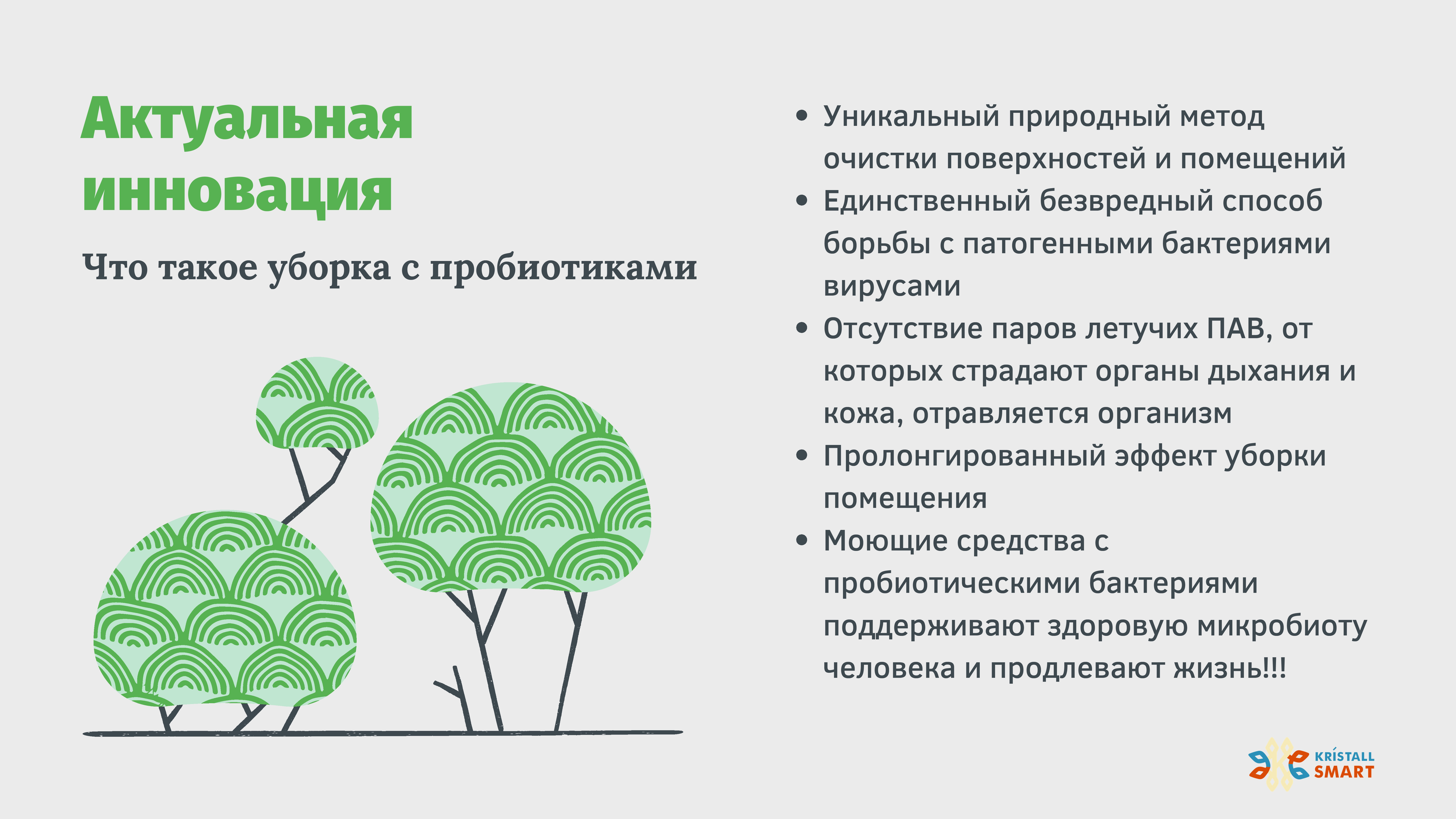 Наша компания является поставщиком уникальных пробиотических моющих средств и безопасных очистителей KRISTALL SMART. Т.к. данные продукты уникальны в своем роде, во многом хороший результат очистки зависит от понимания техногологии действия очистителей и умения правильно применять эти знания. В этом мы видим нашу миссию: информирование об уникальных возможностях и обучение технологии применения. А что может быть лучше практики и наглядного примера? Это стало главным аргументом в пользу создания собственного сервиса по клинингу. Работая с партнерами-клининговыми компаниями хорошо знаем с какими задачами нужно и предстоит справляться.